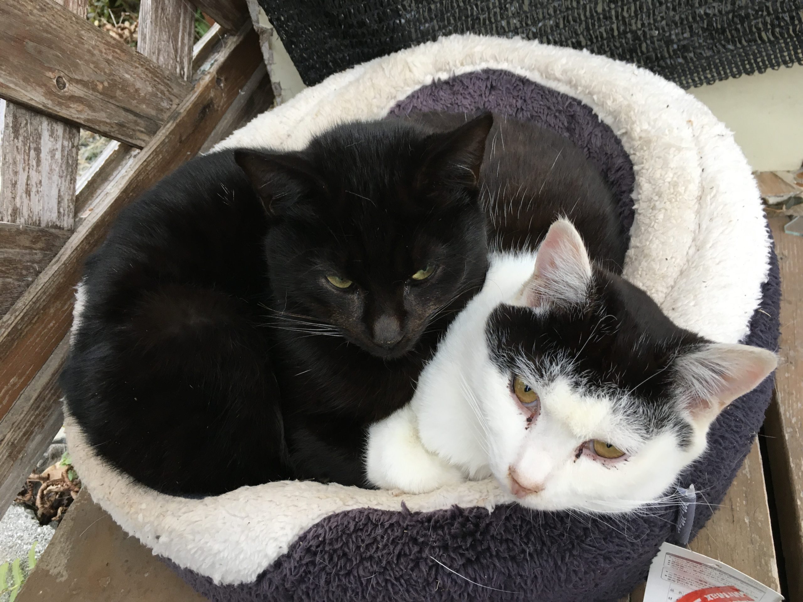 私が玄関を出るだけで飛んで来るようになりました。しかし、今日は玄関から出ても、二匹の子猫は全く反応なしです。こんな事は初めてなので玄関を出て彼らの寝床に行ってみました。二匹とも寝床に起きて座っていました。私がいつも餌を与えないので経験的に認識しているのでしょうか。あんなに喜んで走り寄って来ていたのにと残念がったり、感心したりしています。完全に我が家に居着いたようです。あの、まったり感でそう感じました。