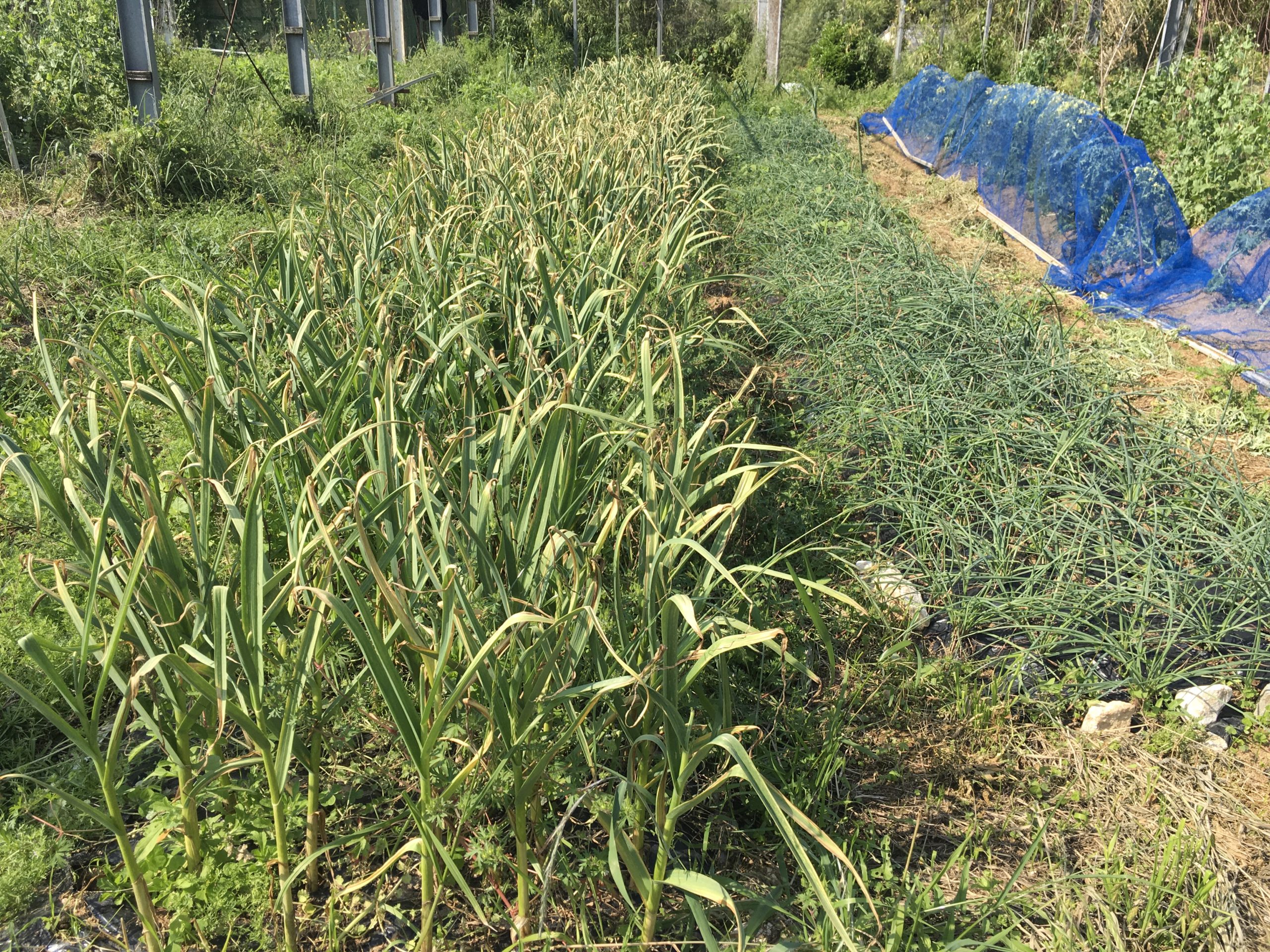 さて、いつ頃が良いでしょうか。ニンニクは十年ぐらい作り続けていますが収穫時期が分かりませんでしたので充分すぎる程熟すのを待つことにしていました。しかし、人に分けてあげる時や売る時には見かけが良くないと良くないと思います。それで今年は収穫期を気にしています。