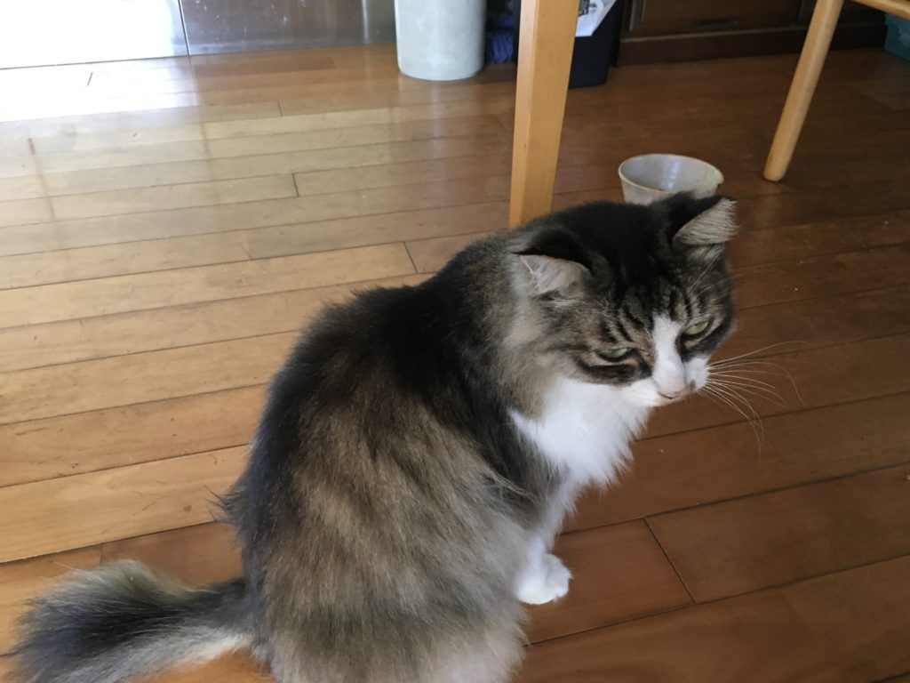 2本のチュールをあっという間に食べ終えると安心したのか、いつもの餌をねだる仕種をします。