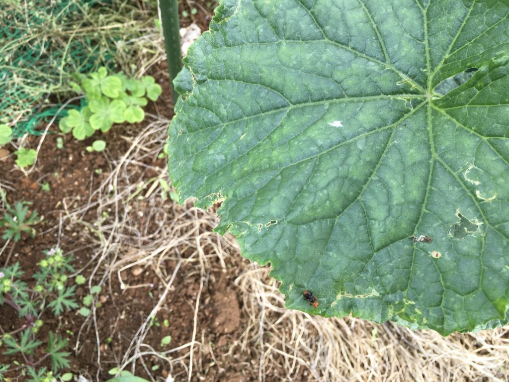 今年はウリハムシが少し多めできゅうりの葉を毎日食べに来ます。毎朝駆除したり追い払うのが日課になっています。