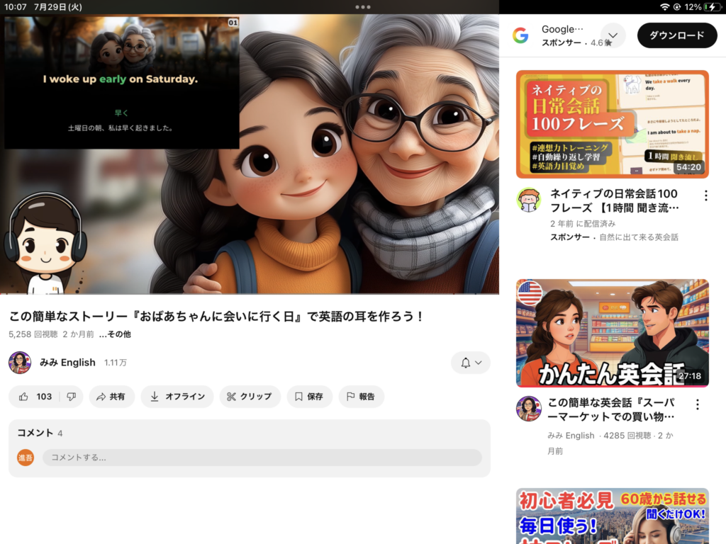 このスクショ画面は私が利用しているYouTube 動画『みみEnglish 』ですが、おばあちゃんを訪ねるストーリーです。短い文章で物語が時間の経過とともに展開していく作りになっています。主語、動詞、形容節と繰り返し繰り返し展開されるので聞き逃す合間もありません。ストーリーの前半は小学生くらいの少女が朝早く起きて電車に乗っておばあちゃんの住んでいる町まで電車で行く内容になっていますが、駅まで母親が車で送って行く展開になっています。そこで私の勘違いが発生します。